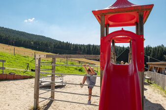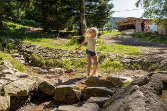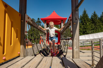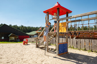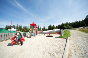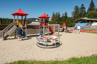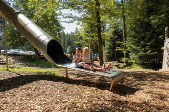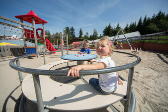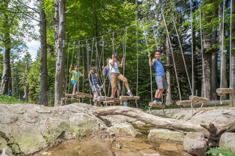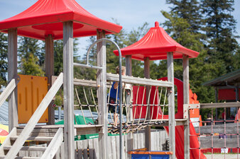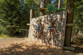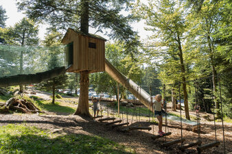 Damals mit erstellt wurde ein Abenteuerwaldspielplatz mit Wasserspiellandschaft, Baumhaus, Tarzan-Brücke, Wendelrutsche, Seilbahn und Kletterwurzeln. An Niederseilelementen können skeptische Eltern mit Ihren Kleinen ausprobieren, ob sie weitere Sphären erklimmen wollen.